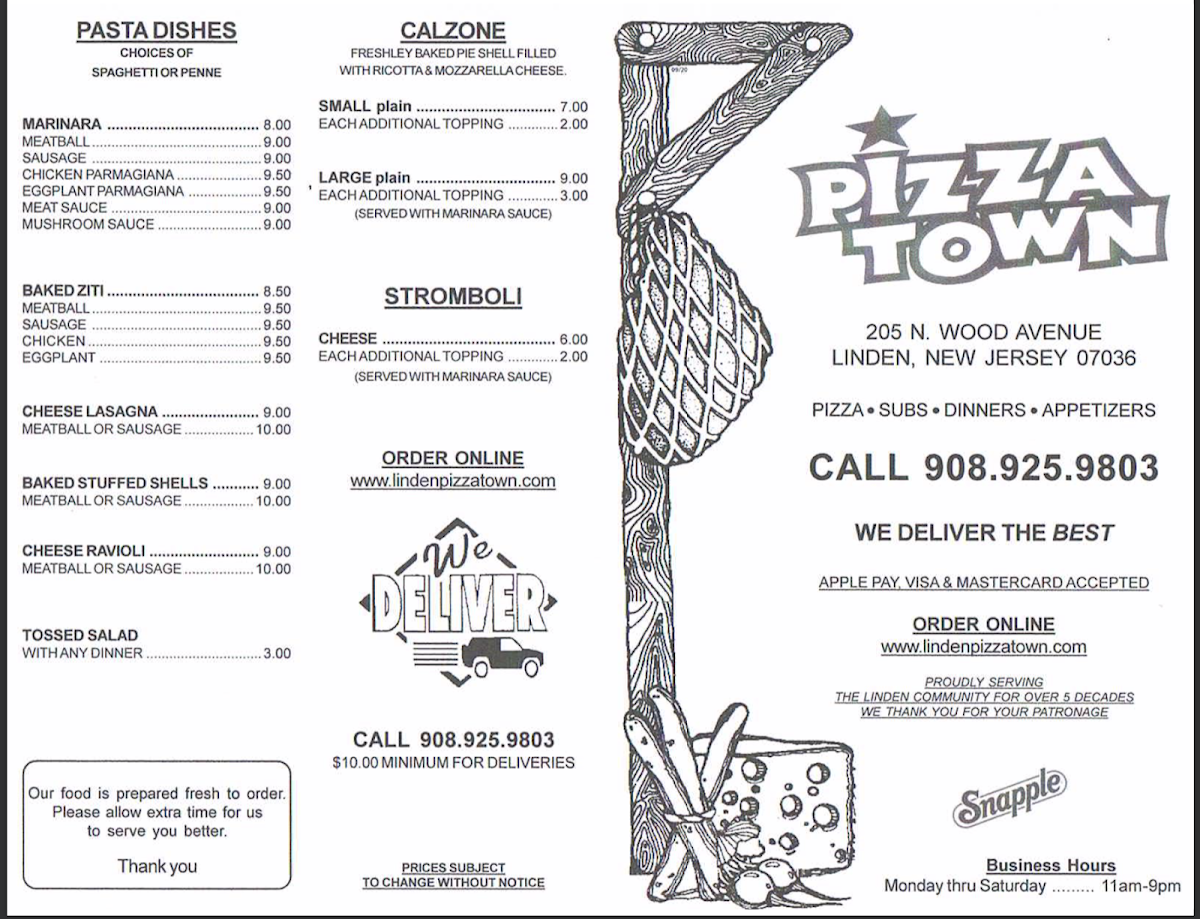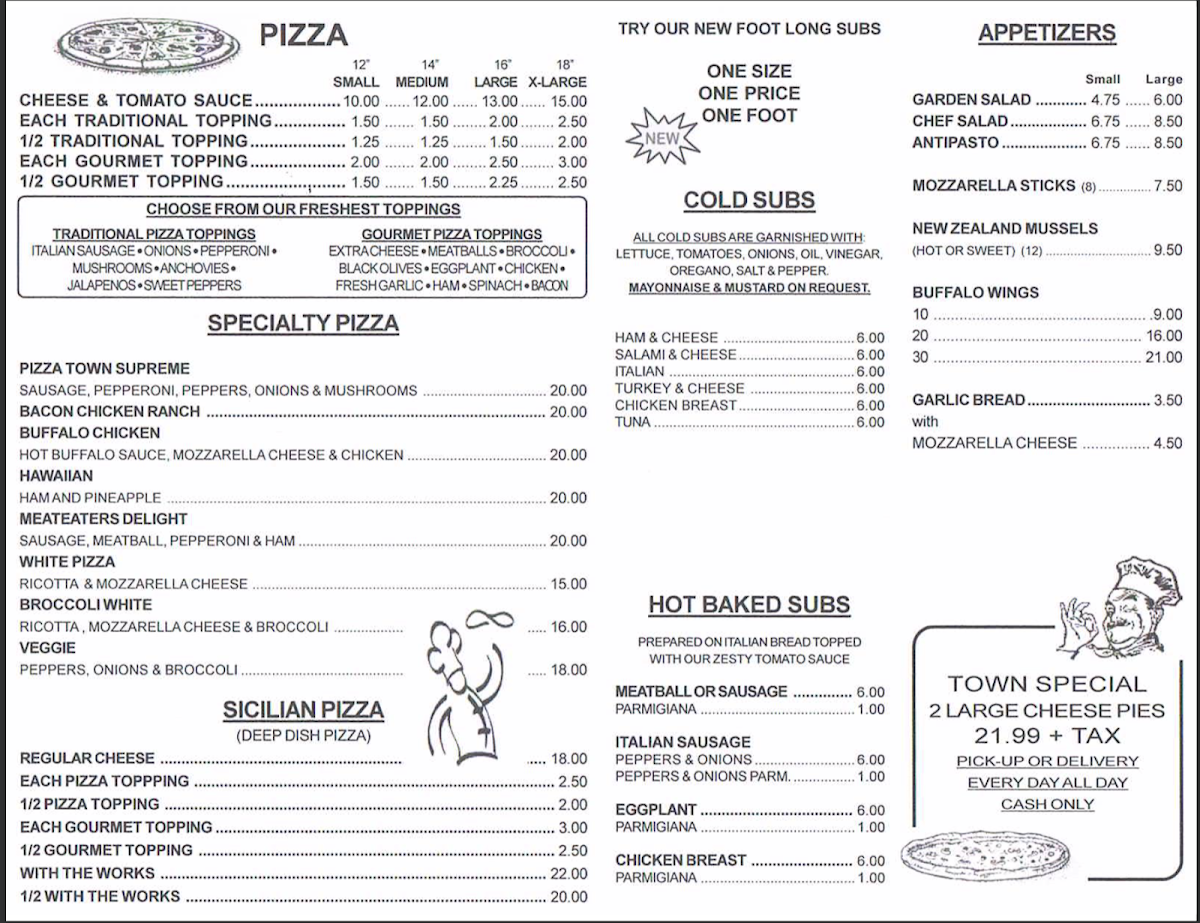 Pizza Town offers a straightforward, comforting menu designed for casual dining and everyday enjoyment. Whether you’re stopping in for a quick slice or gathering with friends and family for a relaxed meal, the selection caters to familiar favorites made with care.